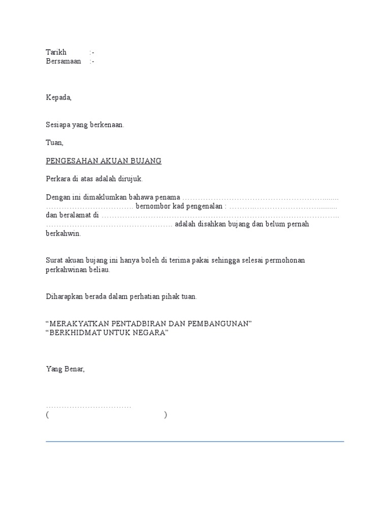 Biasa ketua kampung masing-masing ada surat akuan bujang ini. Scribd is the worlds largest social reading and publishing site. A letter of declaration of bachelor status from the employer.